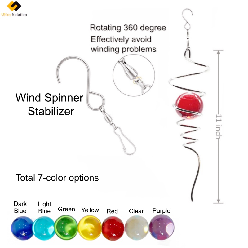 The UFan Solution Wind Spinner Stabilizer is a masterpiece of decorative hardware, constructed to the highest standards. The centerpiece is a luminous, hand-finished glass crystal ball, available in seven popular colors: Dark Blue, Light Blue, Green, Yellow, Red, Clear, and Purple. This Crystal Ball Stainless Steel Wind Spinner component acts as a brilliant focal point, refracting sunlight into dazzling patterns. The ball is securely held by a sturdy iron string cradle, formed through detailed Metal Filigree and Inlay Craft. Attached is the functional heart of the design: a flowing, double stainless steel spiral tail. This double spiral tail stabilizer diy element is not only visually elegant but also aerodynamically balanced to promote stable rotation in the gentlest breeze. Every metal part undergoes Electroplating & Polishing Craft for a durable, rust-resistant finish. The assembly is completed with a robust stainless steel S-hook, connected via the crucial 360-degree swivel that defines this Wind Spinner Stabilizer, effectively preventing winding issues for carefree enjoyment.