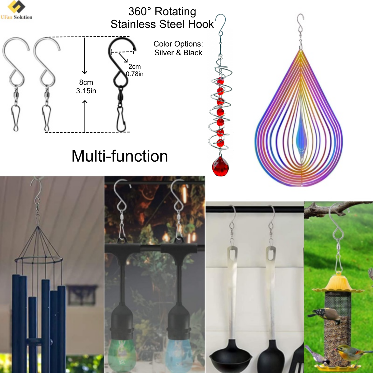 Introducing the premium Swivel S Hook from UFan Solution, your definitive answer to versatile and dynamic hanging needs. This robust hook is engineered for flawless 360-degree rotation. It eliminates tangles and allows suspended items to move freely with the wind or touch. Crafted from high-quality stainless steel, it promises enduring strength and corrosion resistance. Whether for garden, patio, or home, this hook is a fundamental, reliable tool. Its simple design delivers powerful functionality for countless creative and practical applications.